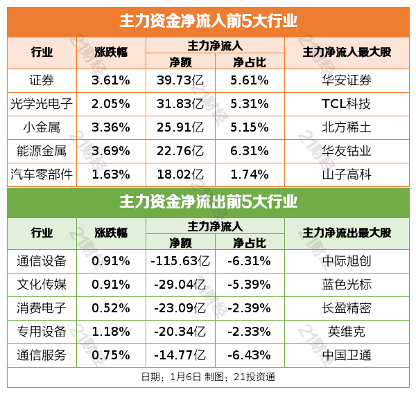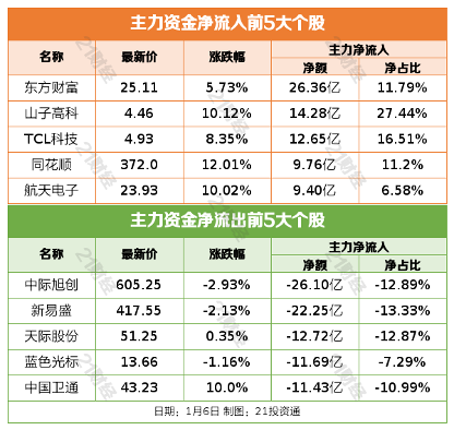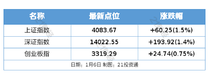 1月6日,三大指数集体收涨,沪指高开高走,再创十年新高。截至收盘,沪指涨1.5%,深成指涨1.4%,创业板指涨0.75%。量能持续放大,沪深两市成交额2.81万亿,较上一个交易日放量2602亿。